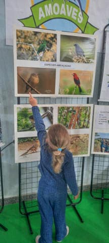 Na ocasião, a AMOAVES realizou uma exposição de 30 fotos de aves se alimentando e/ou caçando, aves de espécies ameaçadas, além de banner de não-aprisionamento de aves e trabalhos escolares do Projeto AVESSOS. Os associados Roberto de Oliveira Silva, Paulo Quadros e Rafael Gonçalves da Silva dialogaram com os visitantes sobre a atividade de observação de aves e sua contribuição com o meio ambiente (confira tópicos abaixo).