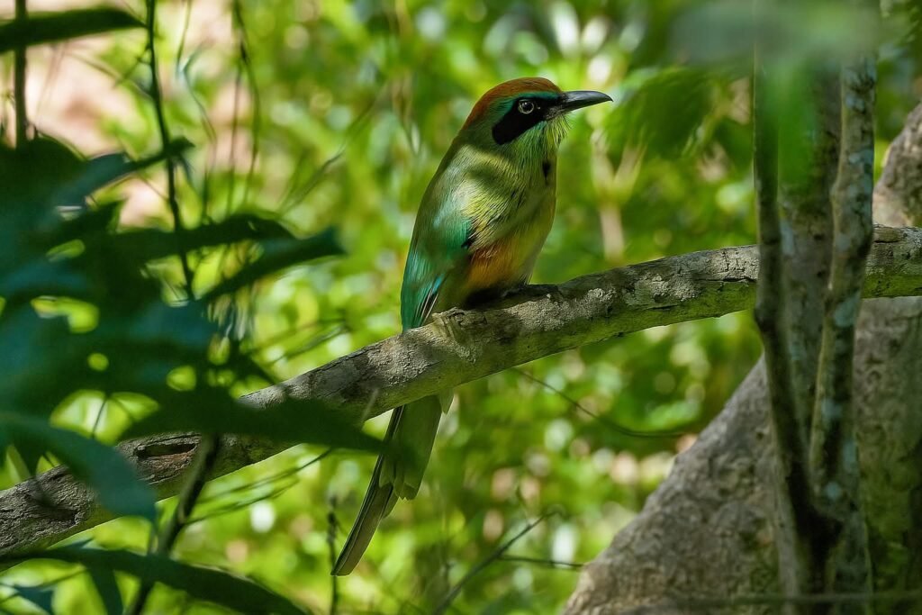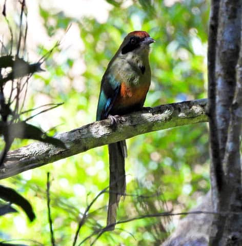 Com sua plumagem chamativa e colorida, o grupo imaginava que seria fácil identificá-la entre os galhos das árvores. Afinal, a descrição é de uma ave de cerca de 42cm, com coloração laranja, desde a base do bico preto até a sua nuca e a mesma coloração no peito. A garganta e a área atrás da máscara preta são verde-claros. O ventre e a extremidade das asas são de cores azuis. As costas e as asas são verde-escuras e a longa cauda é verde até a extremidade onde assume a mesma cor azul da extremidade das asas. E a parte inferior da cauda é preta. Com tantas cores parecia ser fácil encontrá-la. E a encontraram, com ajuda do experiente guia Israel Kuster. Mas fotografá-la seria outra história.