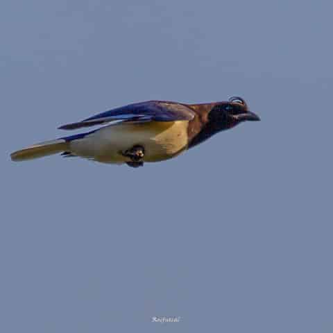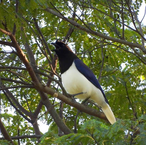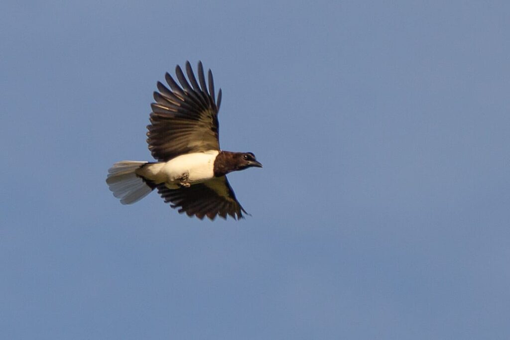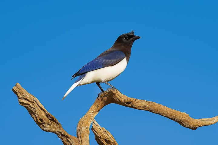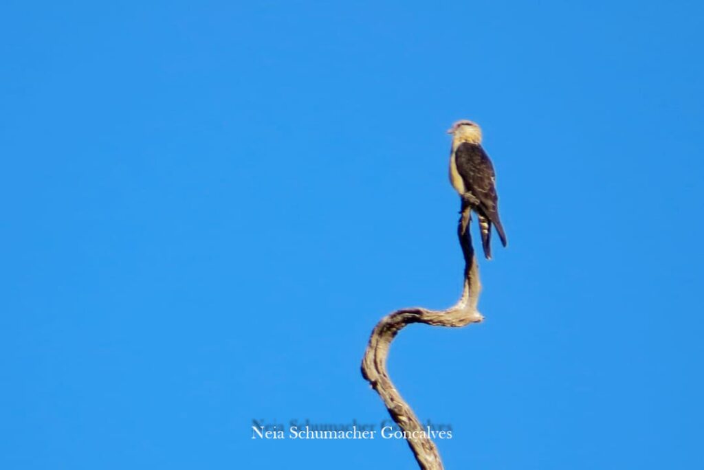 Mas no caminho, antes de chegar ao local onde ela já havia sido registrada, um Carrapateiro chamou a atenção, pousado no alto de um galho seco. E ao parar para fotografá-lo, o grupo se deparou com um casal de gralhas-do-campo! Belíssima espécie de plumagem azul-escura, parte inferior do pescoço e garganta preta, e barriga e ponta da cauda brancas. E um elegante topete frontal!