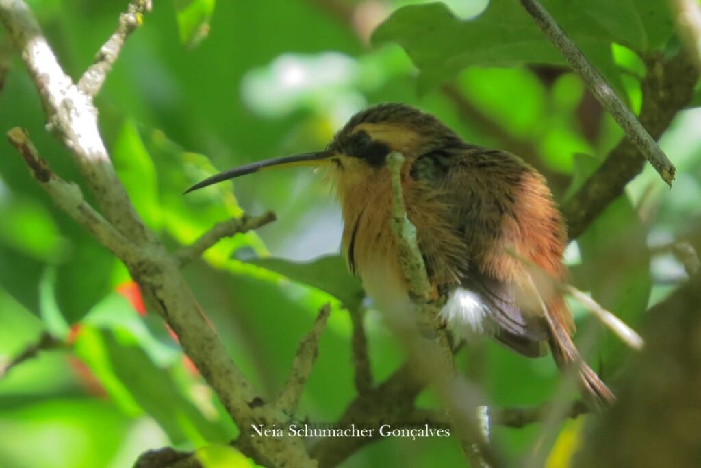 Por cerca de uma hora o grupo ouviu seu canto, viu seus movimentos e por alguns segundos três felizardos conseguiram registrá-la. Uma vitória! Mas ficou nisso! Após algum tempo, o grupo seguiu para o Sítio Gute Stele, na expectativa de encontrar o rabo-branco-mirim e o rabo-branco-rubro, também chamado pássaro do sol vermelho. Ele é um dos menores beija-flores do Brasil.
