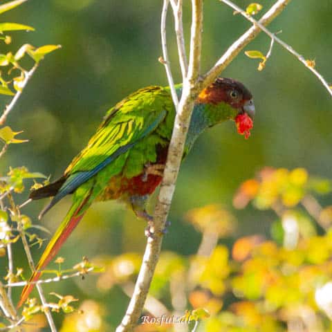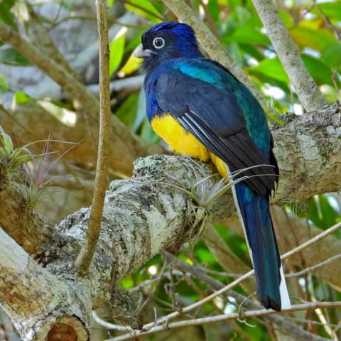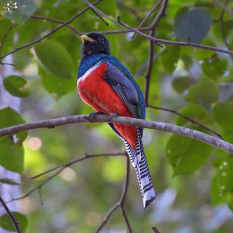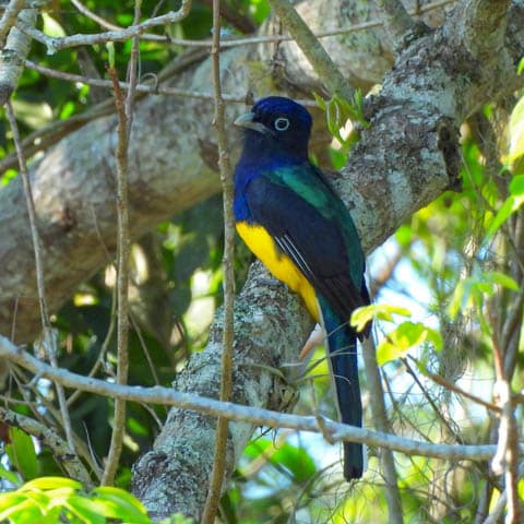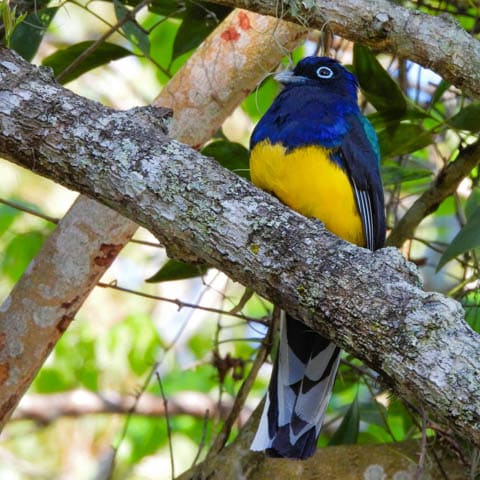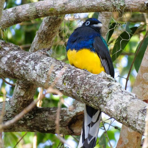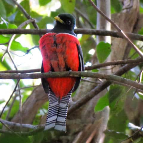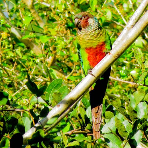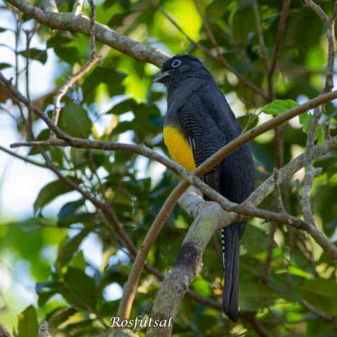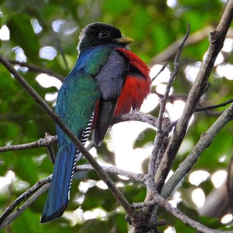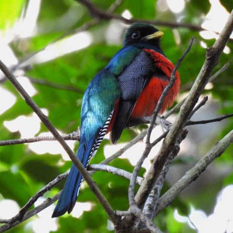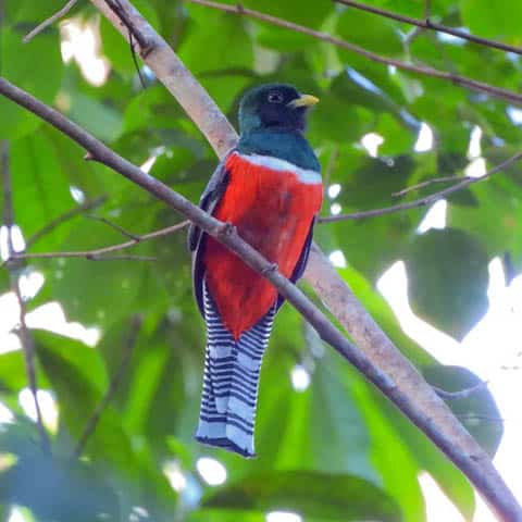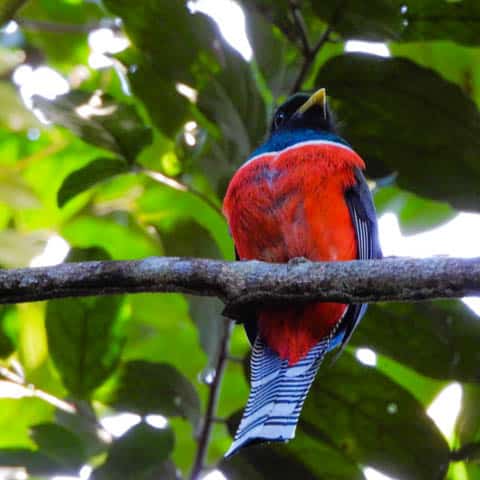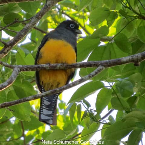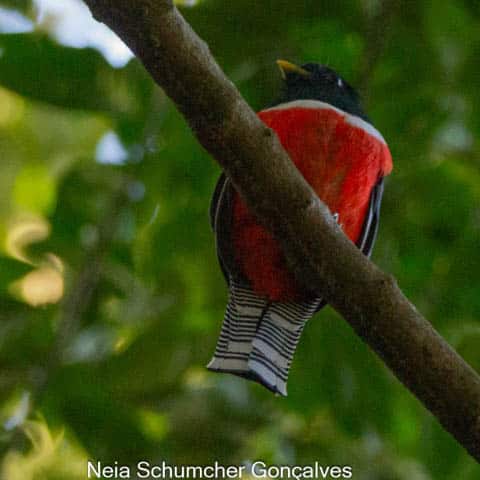 Apesar de ter ouvido sua vocalização, o surucuá-de-coleira ainda permanecia escondido, mesmo após tentativas de avistá-lo em dois pontos distintos de observação. E por sugestão do presidente da AMOAVES, Roberto, o grupo seguiu para outro local, onde a espécie já havia sido fotografada antes. Uma última tentativa. E não demorou nada, assim que o grupo desceu dos carros, ele veio! Chegou com seu voo característico, rápido e curto. Pousou a média altura, como se esperasse a visita dos passarinheiros. Cantou, fez pose, voou, voltou, ficou um bom tempo no local, permitindo ser admirado e fotografado. Missão cumprida! Felicidade geral!