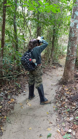 Depois, seguindo por uma das trilhas, um casal de mutum-de-bico-vermelho permitiu ser fotografado antes de se esconder na vegetação. O tempo no meio da mata passa diferente. Quando não tem passarinho pousado, tem outras coisas para observar, como árvores gigantes, flores, borboletas, répteis e, às vezes, você dá sorte de encontrar um mamífero, como o veado-mateiro, que de longe, no meio da trilha, observava o grupo. Animal belo e arisco, mas deu tempo de registrá-lo.