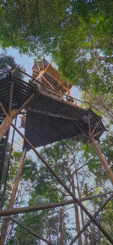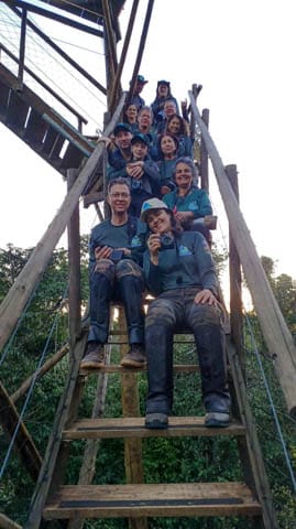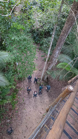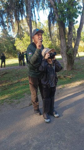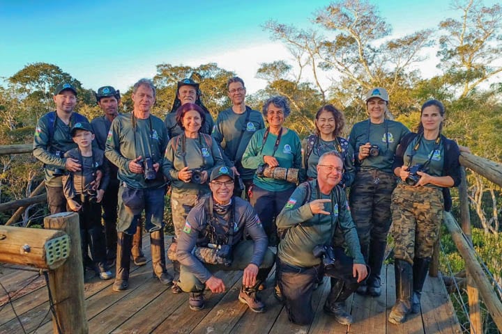 Depois desse grande encontro, era hora de relaxar. Será? A convite do guia Brener Fabres o grupo seguiu para a Torre de Observação de Avifauna, no meio da mata, com capacidade para 15 pessoas e com cerca de 100 degraus. Todos estavam animados para subir e observar, lá do alto, tanto a paisagem quanto as possíveis aves. Não foi fácil, mas ninguém desistiu. O sol estava quase se pondo, e a esta altura nem eram as aves que mais importavam, era o feito, ter chegado lá no alto. Era o vento no rosto. Era o balanço da torre – sim, balança muito! Era a satisfação de todos pelo dia, pelos registros, pela amizade. Um gran finale para aquele sábado!