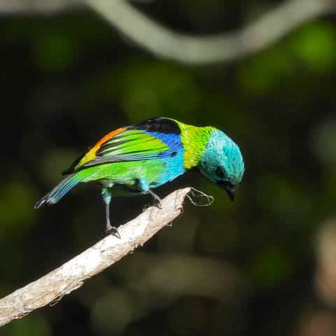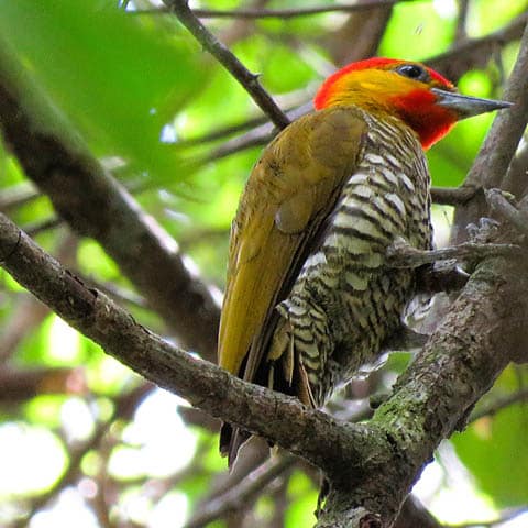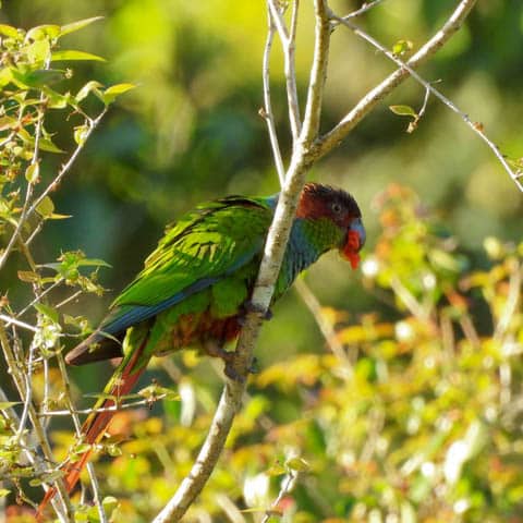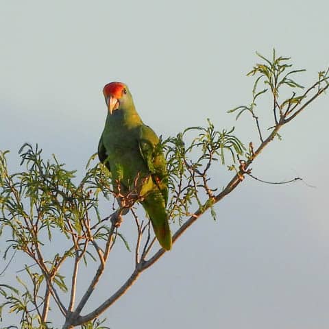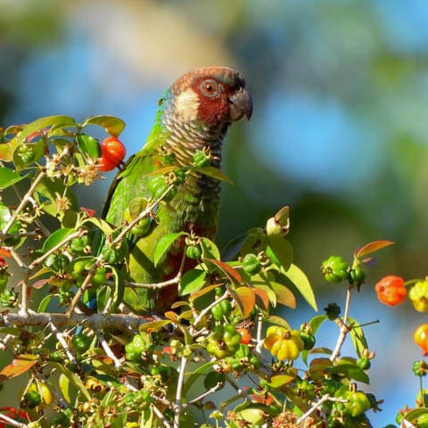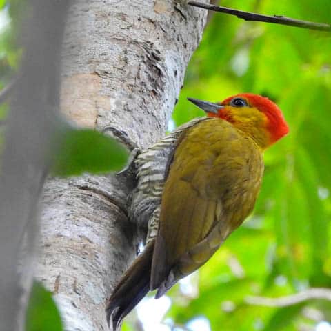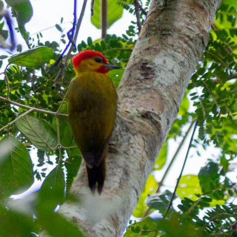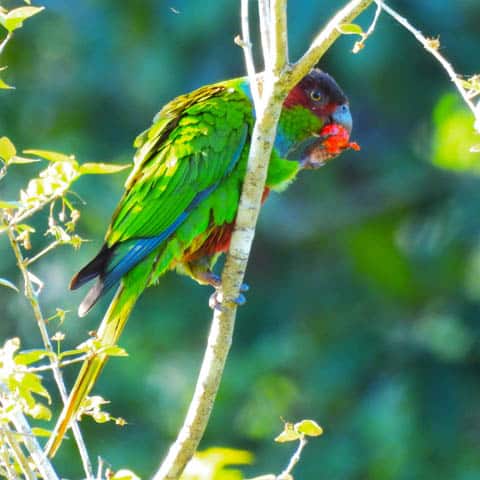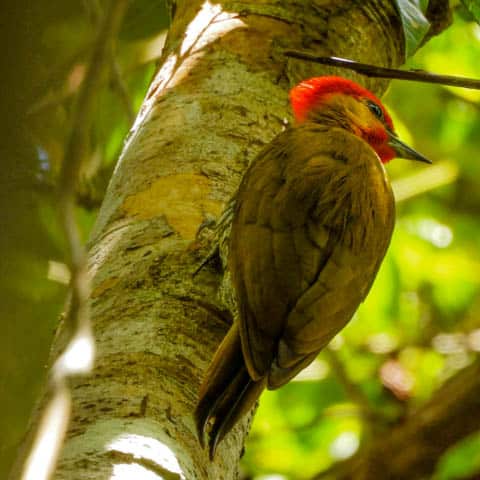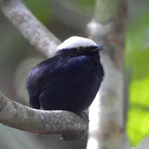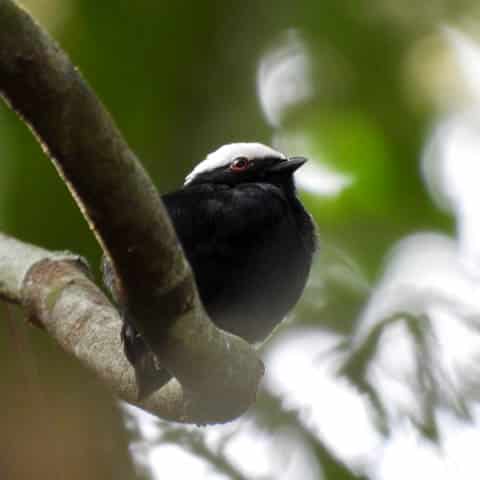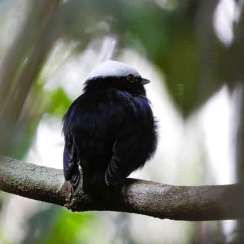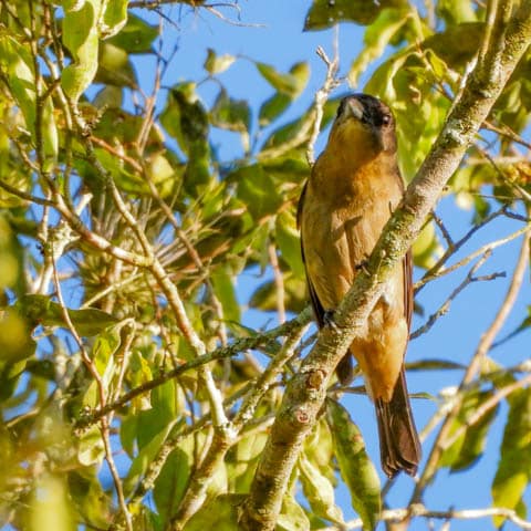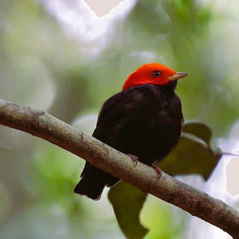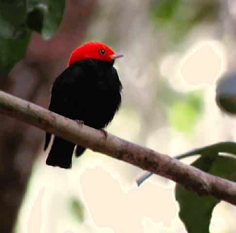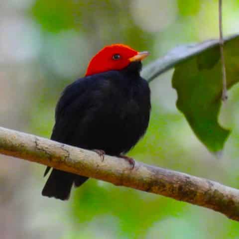 Depois da pausa para o almoço e com a esperança renovada, o grupo partiu novamente para as trilhas em busca de outras espécies, como o cabeça-branca e o cabeça-encarnada, que proporcionaram boas fotos, mesmo pousados entre os galhos das árvores. As cores contrastantes do cabeça-encarnada com o verde da mata deixaram todos emocionados. No Espírito Santo, esta espécie é também conhecida como maria-lenço. Faz sentido, pois ela tem a plumagem do corpo na cor preta e a cabeça vermelha, semelhante a um lenço amarrado.