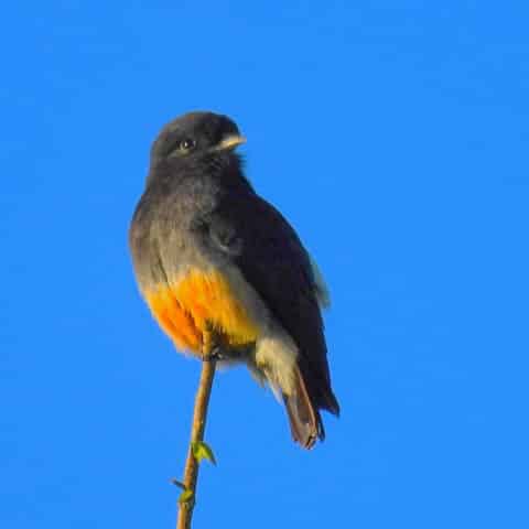 O primeiro local de observação foi próximo à sede administrativa da Reserva. As trilhas são muito limpas e bem cuidadas, com árvores imensas e lindas. A luz do sol conseguia penetrar por entre os galhos e folhas, criando desenhos pelo caminho. E nesse ambiente tranquilo, o silêncio era a principal ferramenta para se encontrar as espécies pretendidas: choquinha-chumbo, Chirito e Rabo-amarelo. Aves raras e de difícil observação. O cuidado para não interferir no seu habitat foi redobrado, sem conversas, sem movimentos bruscos, sem trocar de lugar, apenas aguardar. E assim, com respeito às orientações e todo o cuidado, as três espécies corresponderam, mas não facilitaram. A maior parte do tempo ficaram ocultas na brenha, permitindo poucos registros, muitos parciais, e alguns perfeitos pela sorte de estar no lugar certo e no segundo exato. Mas só o fato de poder ver e ouvir seus cantos já valeu a viagem. Momentos únicos que permanecerão na memória de cada um.