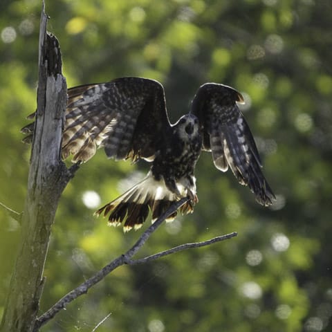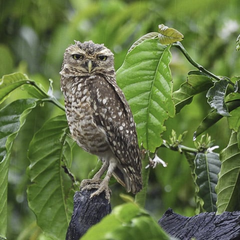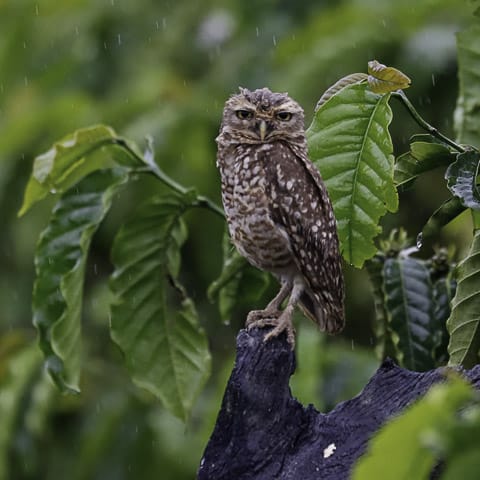 Sem pressa, o grupo percorreu um bom caminho até chegar novamente ao cafezal, onde uma mariquita cantava e se movia alegremente, permitindo a todos fazer lindas fotos e, claro, mais um belo vídeo da Leidemara. E no alto de uma árvore, um ninho de sovi chamou a atenção do grupo. Os pais se revezavam nos cuidados. Mais à frente, a coruja-buraqueira fez poses para o grupo, sem nenhuma pressa.