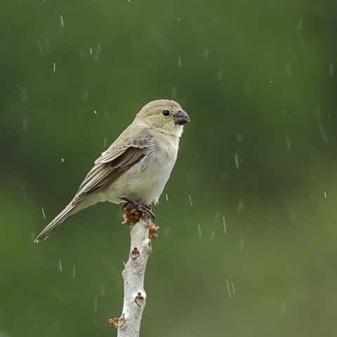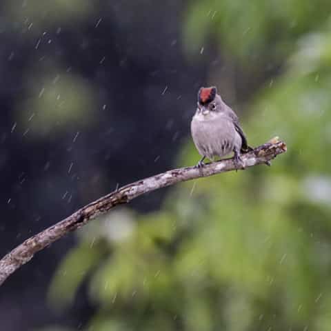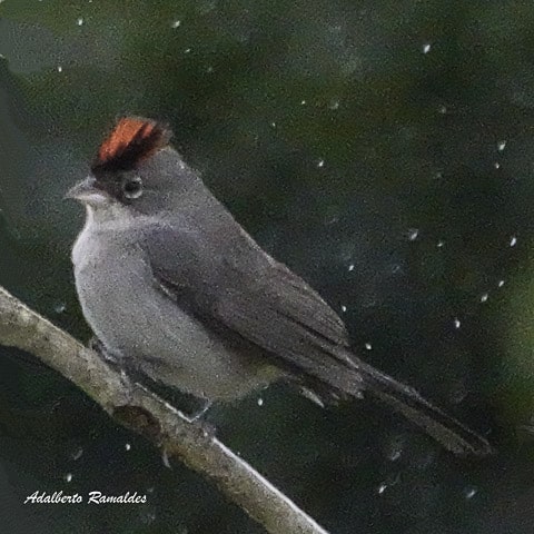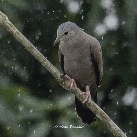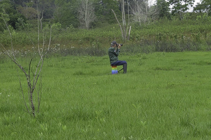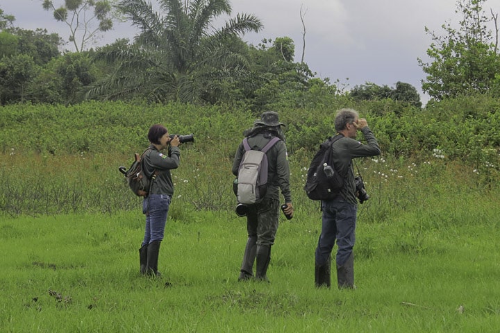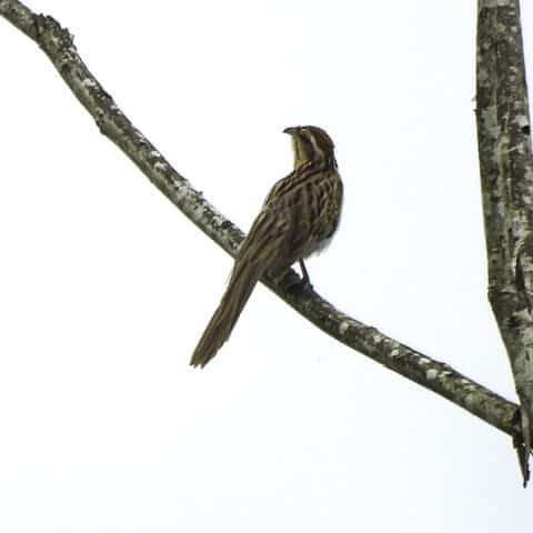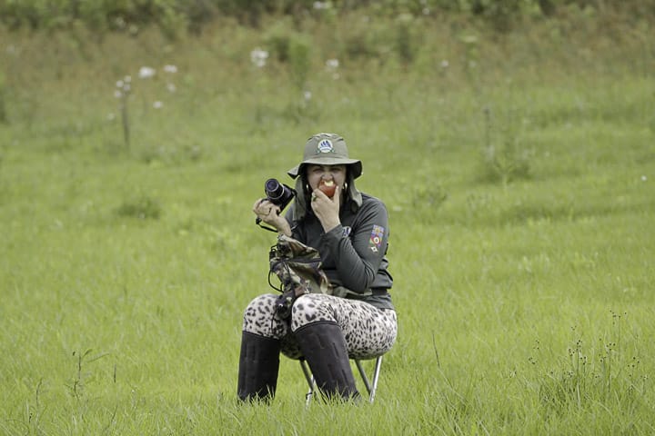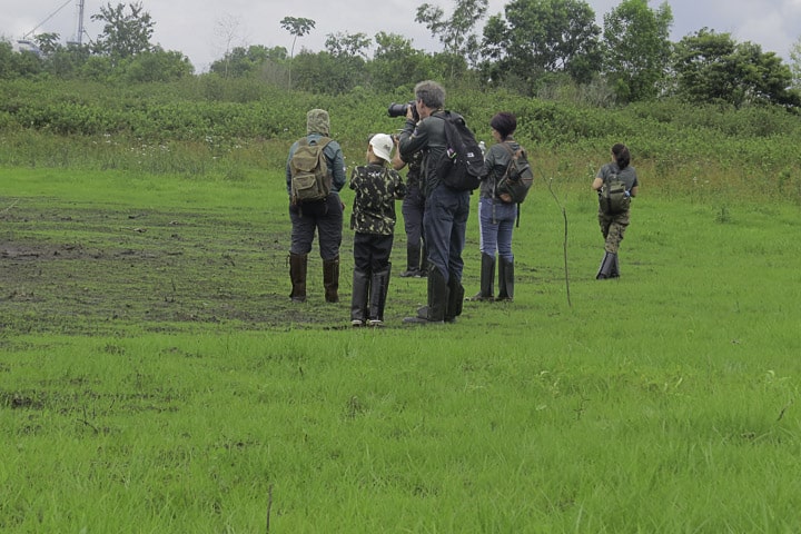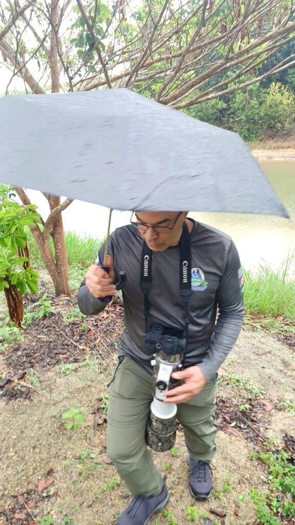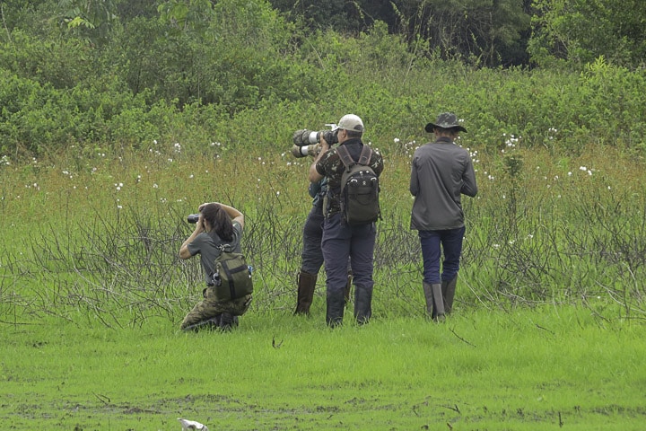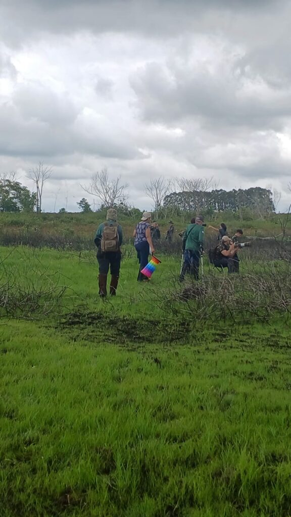 Já no local, a chuva fina persistia, obrigando o grupo a abrir e fechar os guarda-chuvas a cada breve estiada. Embrenhadas no capim, as codornas-do-nordeste cantavam e o grupo se mantinha esperançoso, avançando lentamente pela trilha, enquanto fotografava um coleirinho, uma rolinha-de-asa-canela se alimentando no chão, entre outras aves mais comuns.