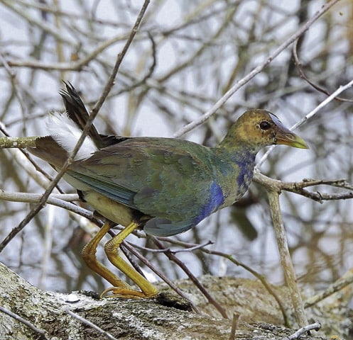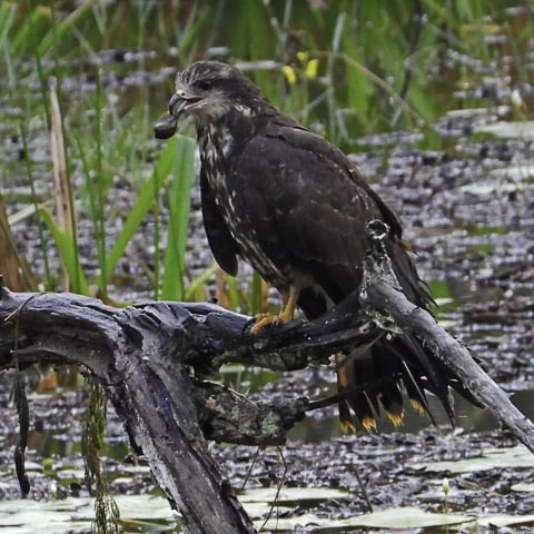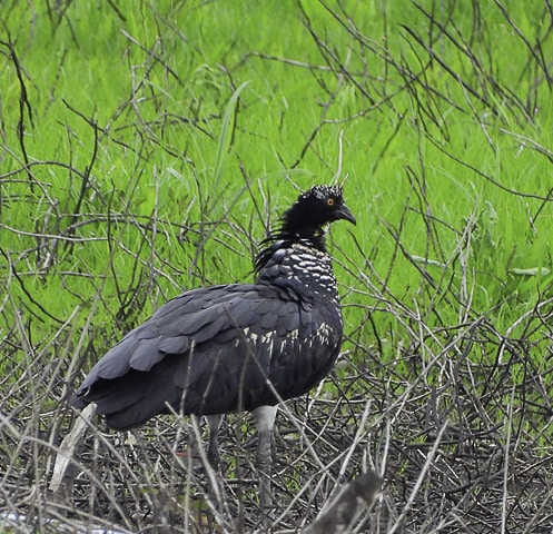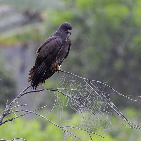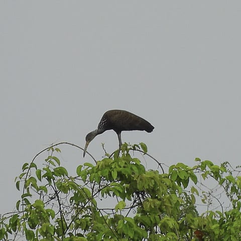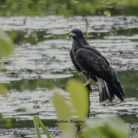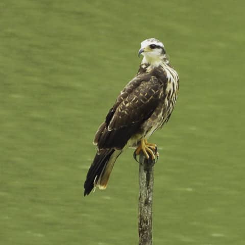 Contrariando os mais otimistas, amanheceu chovendo. Chuva fina, boa para a terra e para as plantações. E, munidos de guarda-chuvas, câmeras fotográficas, baterias carregadas e muita expectativa, o grupo seguiu para o Sítio da Matinha, propriedade do associado Lázaro Ribeiro. Ainda na estrada, em Jaguaré, uma grande lagoa separada pela rodovia fez o grupo desacelerar os carros. E pousados em pequenos tocos dentro da lagoa, vários gaviões-caramujeiros e outras espécies de aves aproveitavam a palidez da manhã para se alimentar. E, como passarinheiro não resiste a um gavião, todos desceram dos carros para fazer fotos antes de seguir viagem.