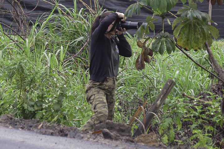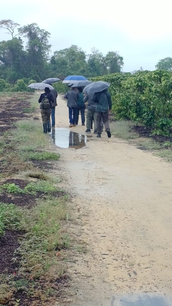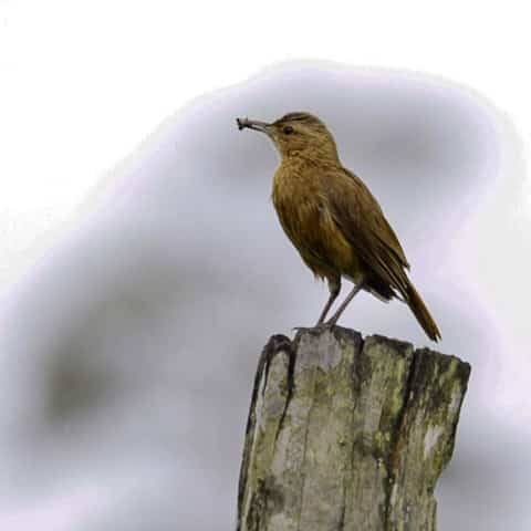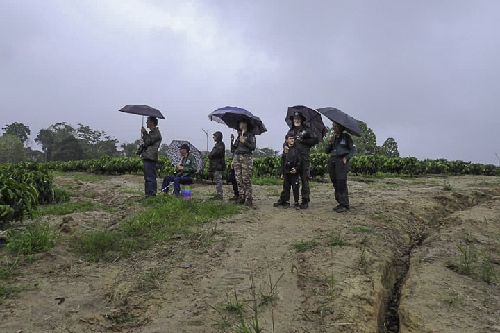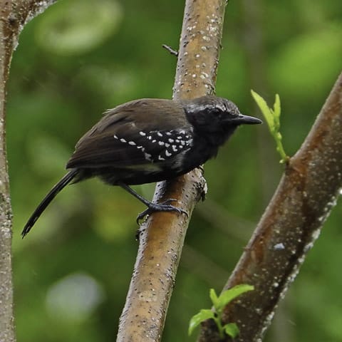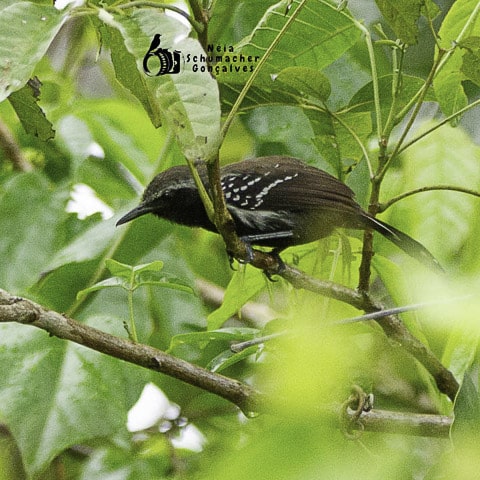 Ainda com a chuva que ia e vinha, após o almoço, o grupo tomou outro caminho, por entre as plantações de pimenta-do-reino e de café, chegando até o local onde encontrariam o papa-formiga-pardo, também conhecido como formigueiro-pardo, espécie difícil de encontrar por gostar de viver em meio à vegetação densa. Mas lá estava um casal, sempre em movimento de um lado a outro da estrada e, também por entre as folhagens. Entretanto, com paciência, todos conseguiram ver sua beleza e registrá-lo em fotos. E ali perto, também estavam o picapauzinho-barrado, choró-boi e outras aves conhecidas.
