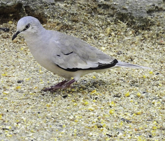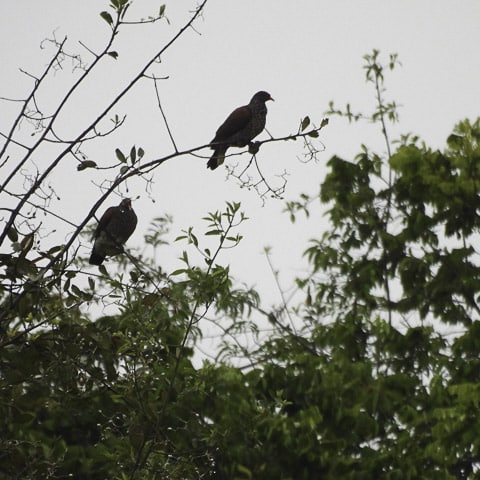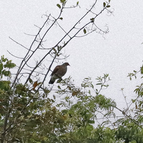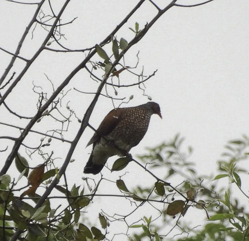 Finalizando a caminhada e de volta à varanda, um café quentinho aguardava os intrépidos passarinheiros. E como disse antes, com uma xícara de café na mão e um olho na mata, Leidemara fotografou o que pensou ser uma aracuã-de-barriga-branca, mas de fato era um lifer para quase todo o grupo: pomba-trocal. Ave linda, também conhecida como pomba-carijó, pomba-divina e pomba-pedrês. Não podia ser melhor o encerramento desse dia!