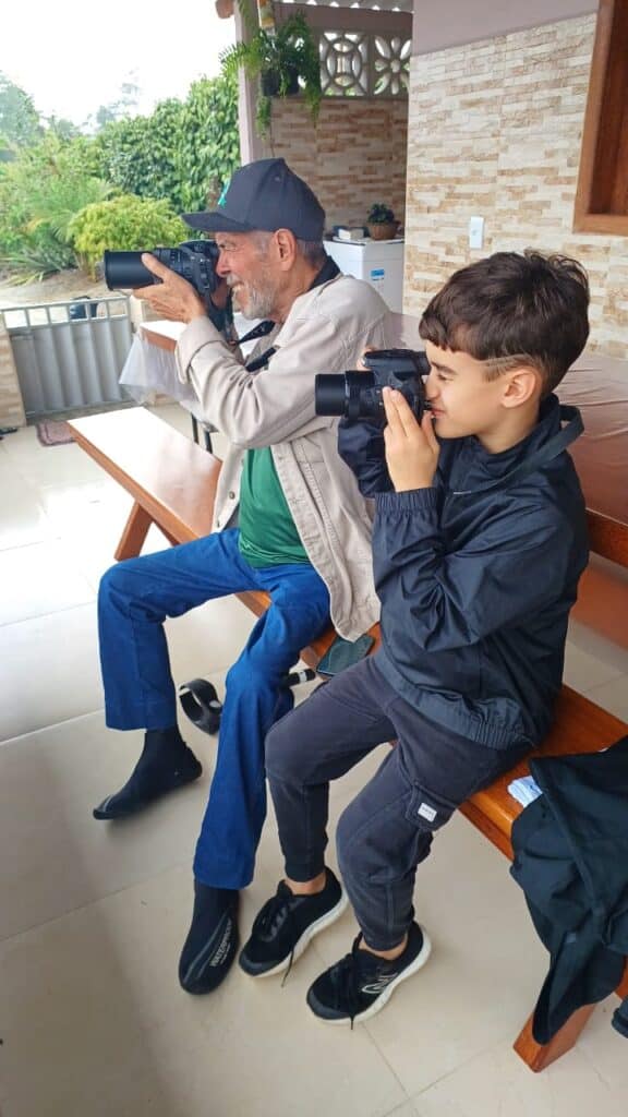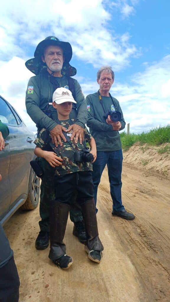Mas um fator que faz toda a diferença é quando esse interesse é compartilhado em família. No grupo são exemplos disso o Leodério Velten com o neto João; a Leimarara Busato com o filho Guilherme; o Jorge Vaccari com o filho Gabriel; e desta vez quem encantou o grupo, foi o Arthur, filho do Lécio Narciso. Criança curiosa, alegre, divertida, respeitosa e incansável. E também bom fotógrafo! Ele encantou o grupo com seu carisma e curiosidade sobre todas as aves, e também com seu conhecimento.